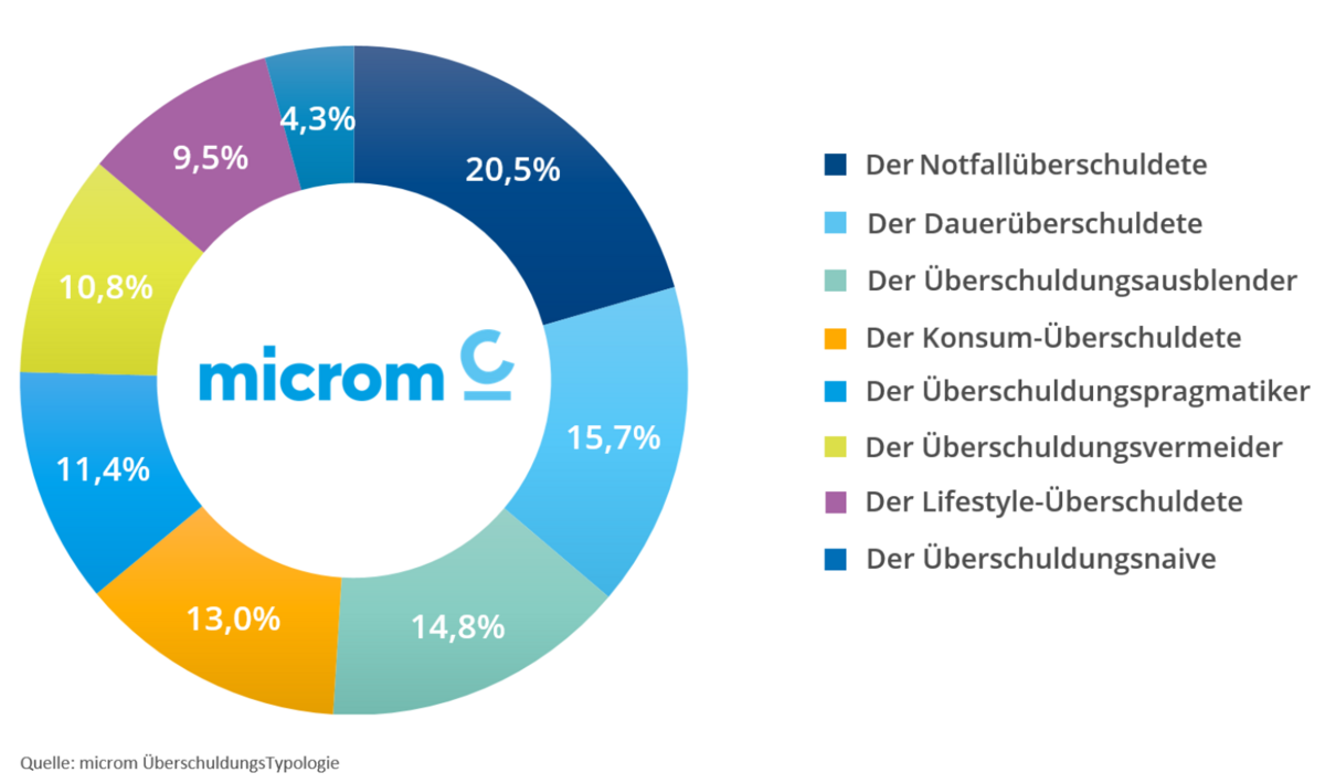 Die microm ÜberschuldungsTypologie identifiziert in diesem Jahr drei Überschuldungstypen, die gegen den Trend merkliche Anstiege der Überschuldungszahlen zeigen: die Dauerüberschuldeten, Konsumüberschuldeten und die Überschuldungspragmatiker. Diese Menschen stecken entweder schon länger in der Überschuldung fest oder sind im letzten Jahr aus verschiedenen Gründen in Zahlungsschwierigkeiten geraten. Wie in den letzten drei Jahren betrifft dies vor allem die Gruppe der „Dauerüberschuldeten“. Bei den beiden anderen Typen spielen verstärkter Konsum und Nachholbedarf eine Rolle: die „Konsumüberschuldeten“ und die „Überschuldungspragmatiker“.