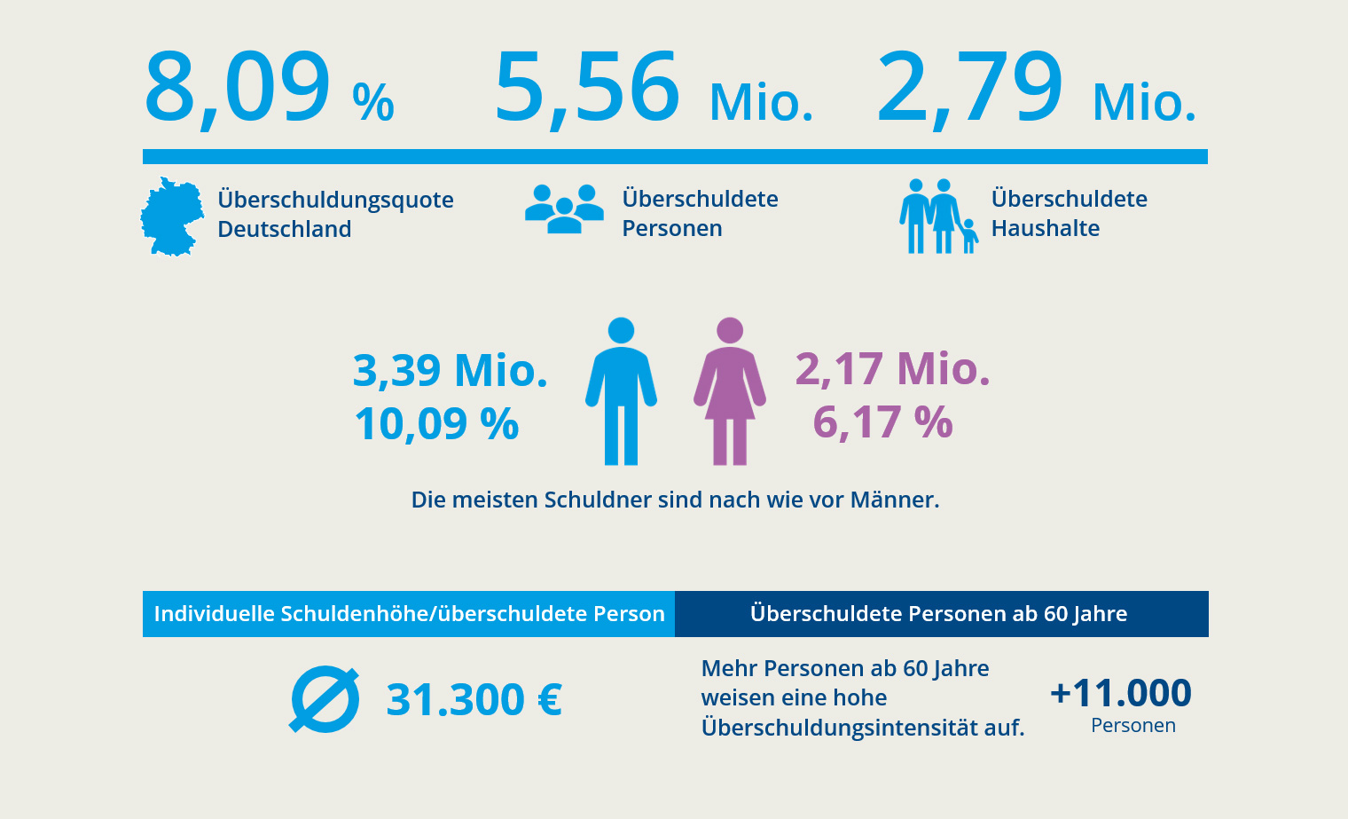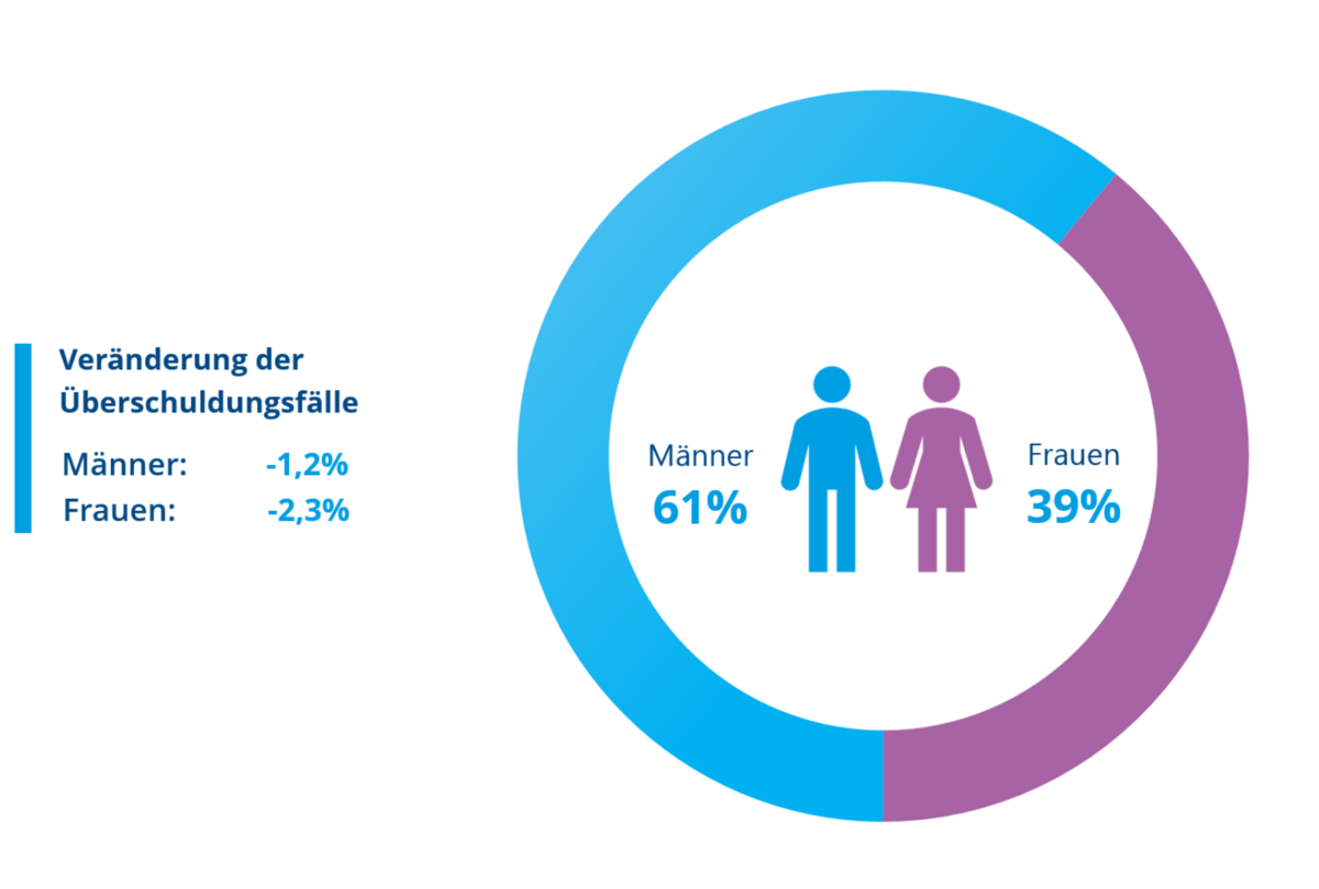Bemerkenswert ist, dass die Zahl überschuldeter Frauen mit einem Rückgang von 52.000 Fällen (-1,6 Prozent) stärker abnimmt als bei den Männern, wo der Rückgang bei 42.000 Fällen (-0,1 Prozent) liegt.