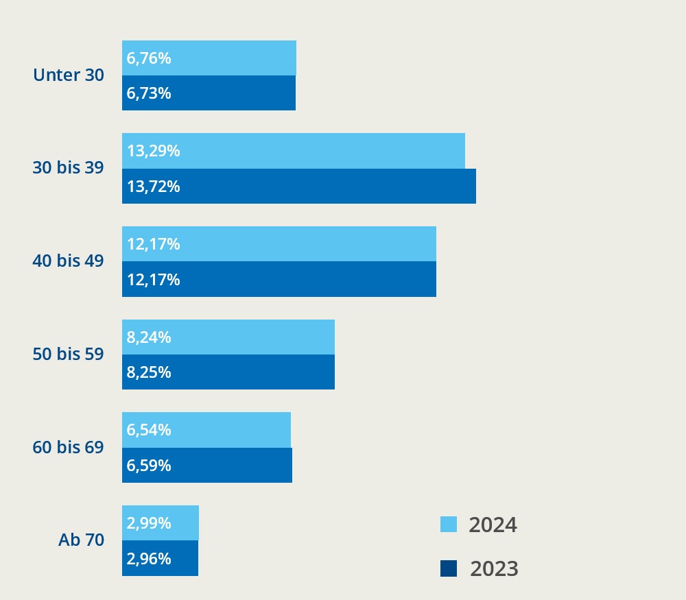 Nur die jüngste Altersgruppe (unter 30 Jahre, 6,76 Prozent) und die älteste (ab 70 Jahre, 2,99 Prozent) zeigen in 2024 einen leichten Anstieg der Überschuldungsquoten, beide um +0,03 Punkte. Besonders bei den unter 30-Jährigen ist das bemerkenswert, da ihre Überschuldung nach jahrelangem Rückgang zwischen 2013 und 2022 nun zum zweiten Mal in Folge zunimmt.