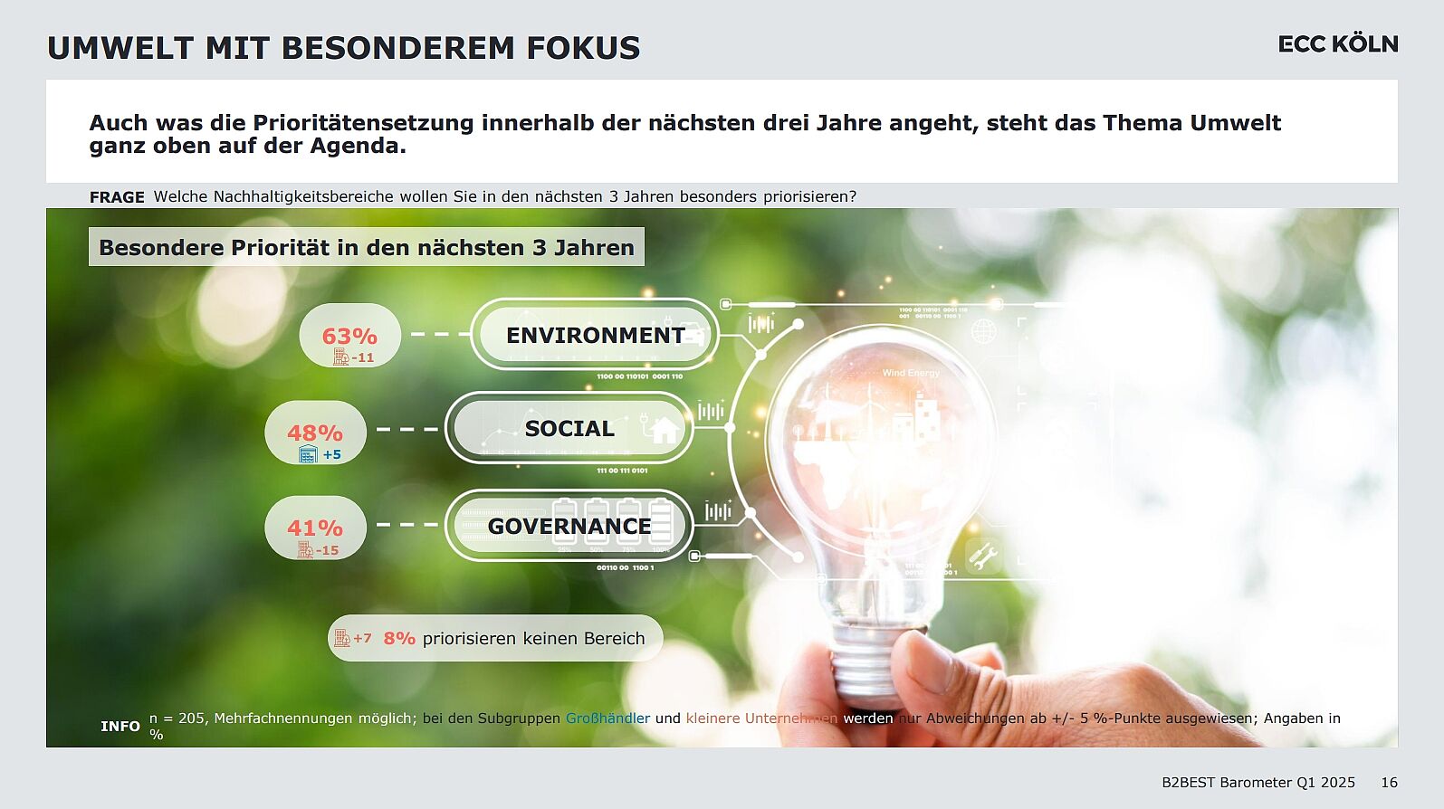 Besonders häufig wird das Thema Nachhaltigkeit mit Umwelt-Themen in Verbindung gebracht. So etwa mit Klimaschutz-Maßnahmen, umweltbewusstem Handeln, maßvollem Umgang mit Ressourcen, Energiesparen oder mit grünen Energiequellen. Das zeigt auch die Studie B2Best Barometer Q1/2025 des ECC Köln, die im März 2025 in Zusammenarbeit mit Creditreform erschienen ist. Hier wurden Großhändler und Hersteller zum Fokusthema ESG befragt. Auf die Frage hin, welchem Aspekt sie in den kommenden drei Jahren besonders hohe Priorität schenken wollen, antworteten 63 Prozent mit „Umwelt“.4
