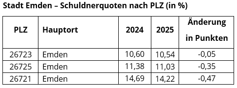 Die Stadt Emden verzeichnet insgesamt eine Schuldnerquote von 12,00 Prozent (2024: 12,32 Prozent). Die Zahl der überschuldeten Personen liegt hier bei etwa 5.000.