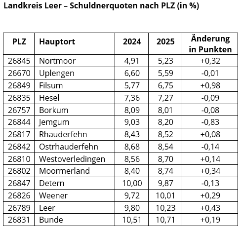 Für den Landkreis Leer liegt die Quote bei 8,87 Prozent. Innerhalb des Landkreises ist die Verschuldung in acht Gemeinden gestiegen. Somit sind insgesamt rund 12.500 Personen überschuldet. Die deutlichste Verbesserung – um minus 0,83 Punkte – verzeichnet Jemgum.