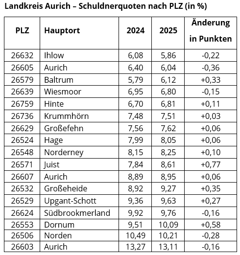 Die deutlichste Verschlechterung zum Vorjahr zeigt sich auch in diesem Jahr auf Juist, mit einem Plus von 0,77 Prozent. (2024: plus 0,97 Prozent). In der Stadt Aurich liegt die durchschnittliche Quote bei 9,31 Prozent (2024: 9,89), wobei das Postleitzahlengebiet 26603 Aurich das Schlusslicht im Landkreis mit 13,11 Prozent (2024:13,27 Prozent) bildet.