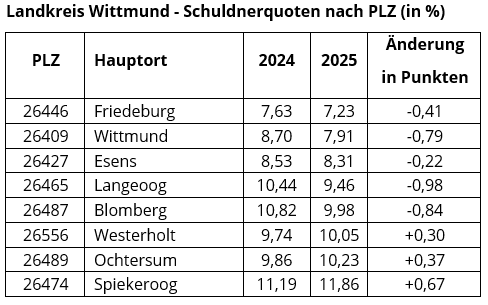 Im Kreis Wittmund bildet Spiekeroog das Schlusslicht mit 11,86 Prozent (2024: 11,19). Die Nase vorn hat Friedeburg mit 7,73 Prozent. Insgesamt sind im Landkreis 8,34 Prozent und somit rund 4.300 Personen überschuldet (2024: 8,78 Prozent).