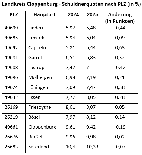 Wie auch in den letzten Jahren weist der Landkreis Ammerland mit einer Quote von 6,31 Prozent die geringste Überschuldung zwischen Weser und Ems auf. Den Platz zwei belegt die Grafschaft Bentheim mit aktuell 6,65 Pro-zent, gefolgt vom Landkreis Oldenburg mit 6,78 Prozent. Dahinter – aber immer noch unterhalb des Weser-Ems-Durchschnitts – liegen die Landkreise Osnabrück (7,10 Prozent), Vechta (7,29 Prozent), Emsland (7,36 Prozent) und Friesland (7,37 Prozent) sowie die Stadt Oldenburg (8,01 Prozent).